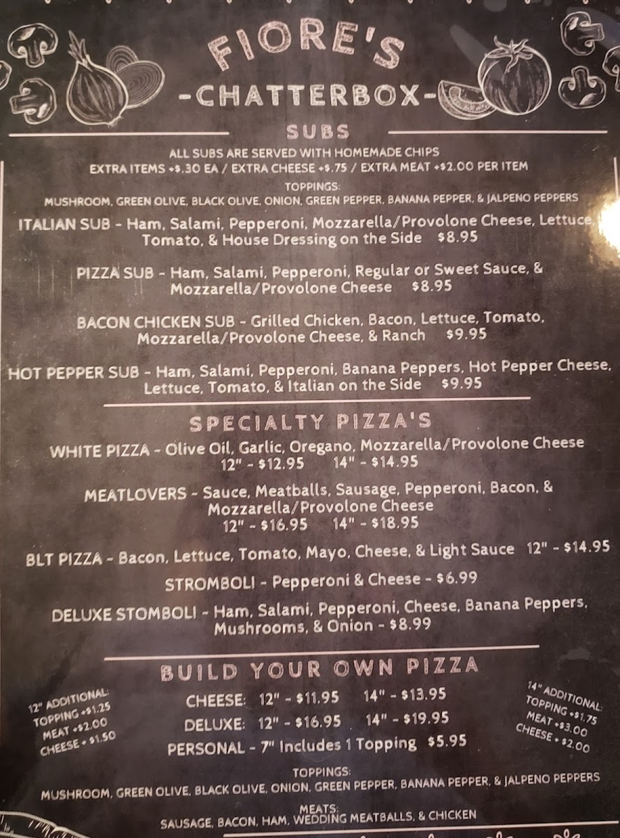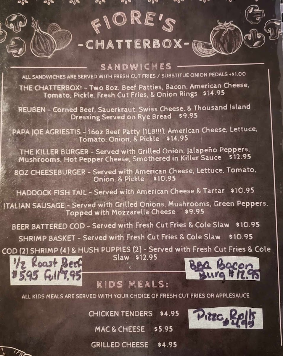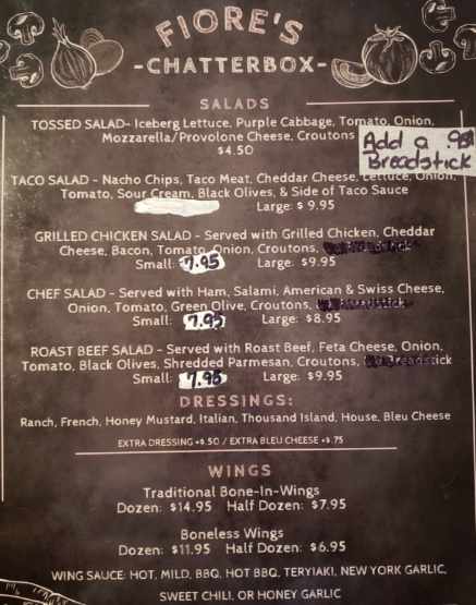 The menu is diverse, featuring a variety of fresh sides such as homemade chips and cole slaw, along with salads ranging from Chef Salad to Grilled Chicken Salad. Wing lovers can choose between traditional bone-in and boneless options, all prepared with care. Each dish reflects the essence of down-home cooking that guests have come to love. With its inviting atmosphere and attentive service, Fiore's is perfect for family gatherings or a romantic dinner. Come and savor the experience!
